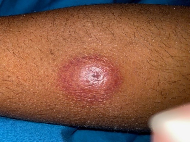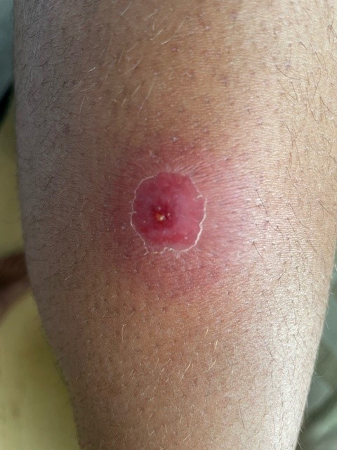 By the time our member noticed the bite the pressure had already built to the place of pain. He decided to lance the bite. He admitted all he got out at this point was blood. No puss was released by this early cut.